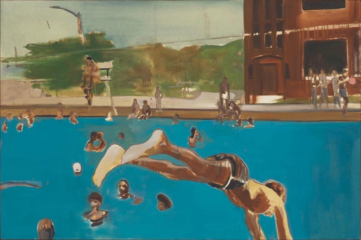 Inspired by a snapshot taken by his mother in Chicago’s South Side during the 1970s, this painting, like Hockney’s, evokes the joy of a pool on a hot hot day. Unlike Hockney, Davis brought a political dimension to his work, showing a segregated pool full of black swimmers.